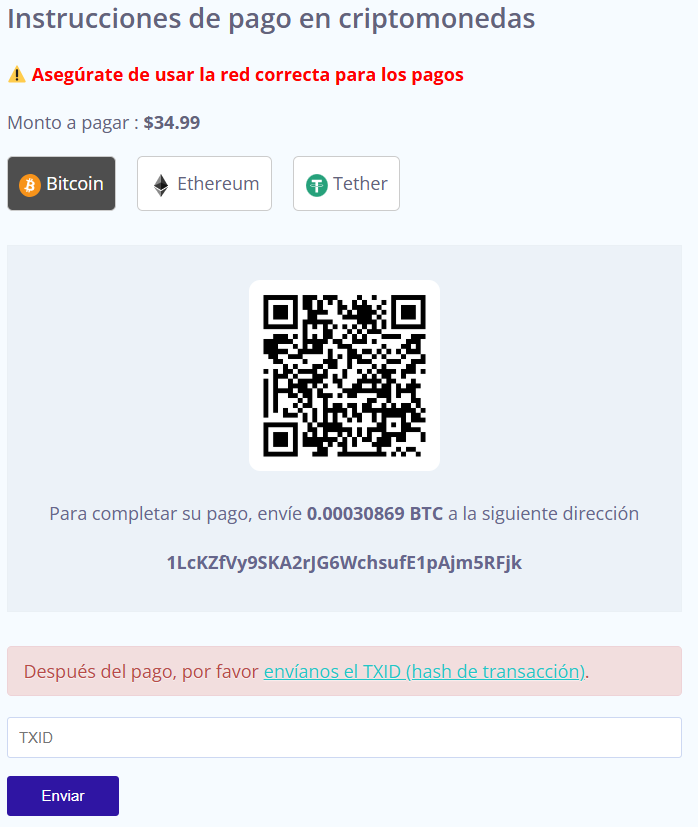 Una vez realizado el pago envíanos el TXID de transacción. Nosotros lo revisaremos a la brevedad posible y activaremos su compra.