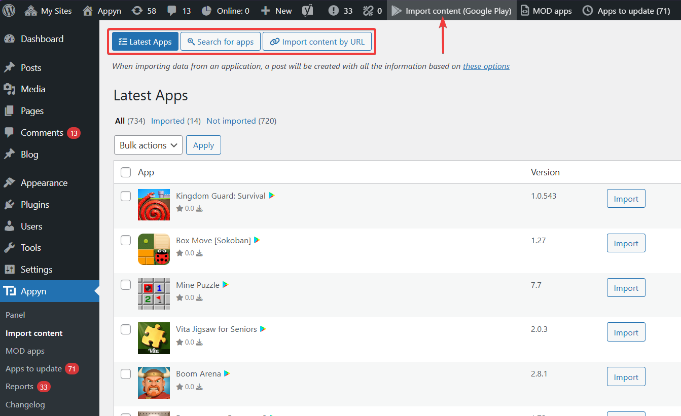 In the top admin bar, you’ll find the “Import content (Google Play)” button.