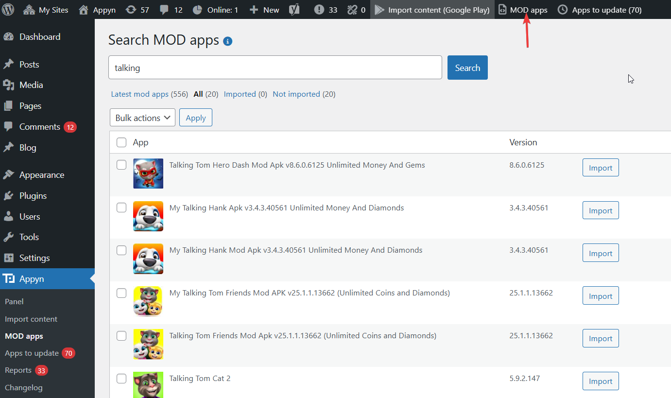 We know that many users often spend time searching for this type of app on different websites. That’s why, in Appyn, we’ve included a specialized search tool that allows you to easily find modified apps in various versions and import them to your site with just a few clicks.
